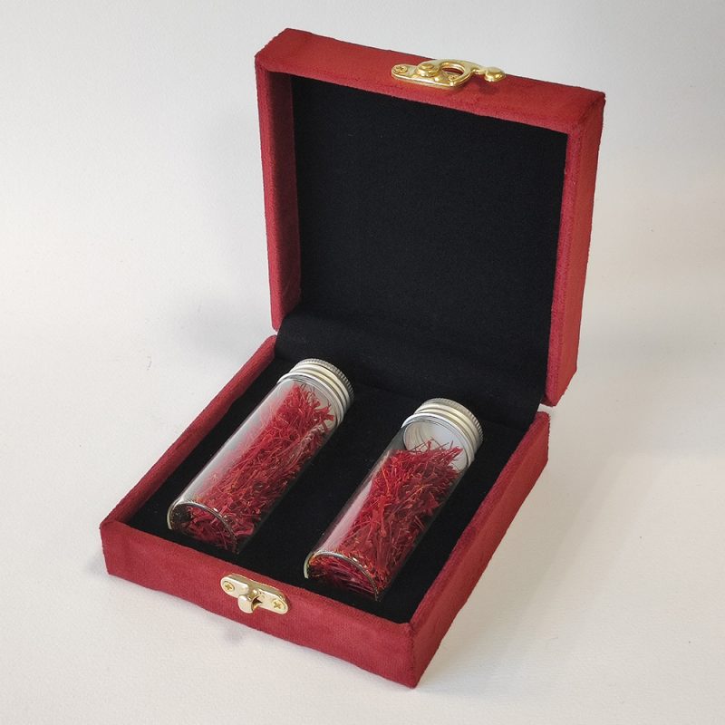 The velvet box, crafted in rich red tone, exudes luxury the moment you hold it. Inside, two sleek glass jars protect the saffron from light and humidity—keeping the aroma fresh and the threads intact.