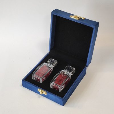 The saffron is packaged in an elegant metal container with a traditional Persian motif, combining sophistication with freshness protection. The outer box, wrapped in soft velvet fabric, is available in blue and red tones, creating an impression of true luxury from the first glance.